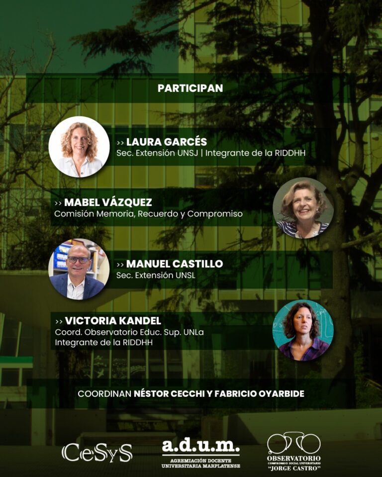 Desde el observatorio sobre Compromiso Social Universitario “Jorge Castro” perteneciente al CeSyS-ADUM, invitamos a ustedes a un nuevo encuentro para reflexionar sobre la Educación Superior desde una mirada centrada en los Derechos Humanos. El mismo se llevará a cabo este jueves 8 de mayo a las 18 horas en modalidad zoom.