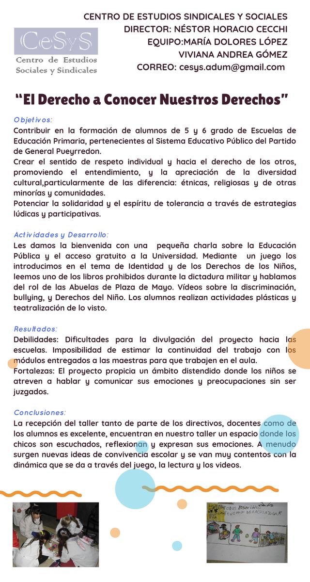 En este periodo (que abarcó de agosto-octubre) asistieron a ADUM grupos de 40 estudiantes pertenecientes a distintas escuelas. Siendo 5 Municipales (la Municipal 15, la Municipal 2, la Municipal 6 y además visitamos con el taller, a las escuelas 15 y 16 ambas del turno tarde).También se hicieron presente 4 y 5 grado de las Escuelas Provinciales Nº 15, 66, 2 y la 12. Todas acompañados de sus docentes. El director del CeSyS- Adum, Néstor Cecchi y Viviana Gómez, propusieron un conjunto de actividades formativas y participativas a los estudiantes con la convicción que la educación en derechos humanos proporciona los mecanismos para protegerlos, promoverlos y aplicarlos a la vida cotidiana.