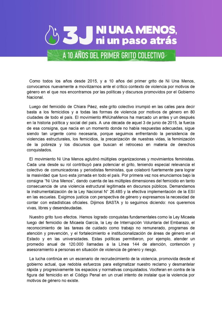 10 años del primer grito de Ni Una Menos, convocamos nuevamente a movilizarnos ante el crítico contexto de violencia por motivos de género en el que nos encontramos por las políticas y discursos promovidos por el Gobierno Nacional.