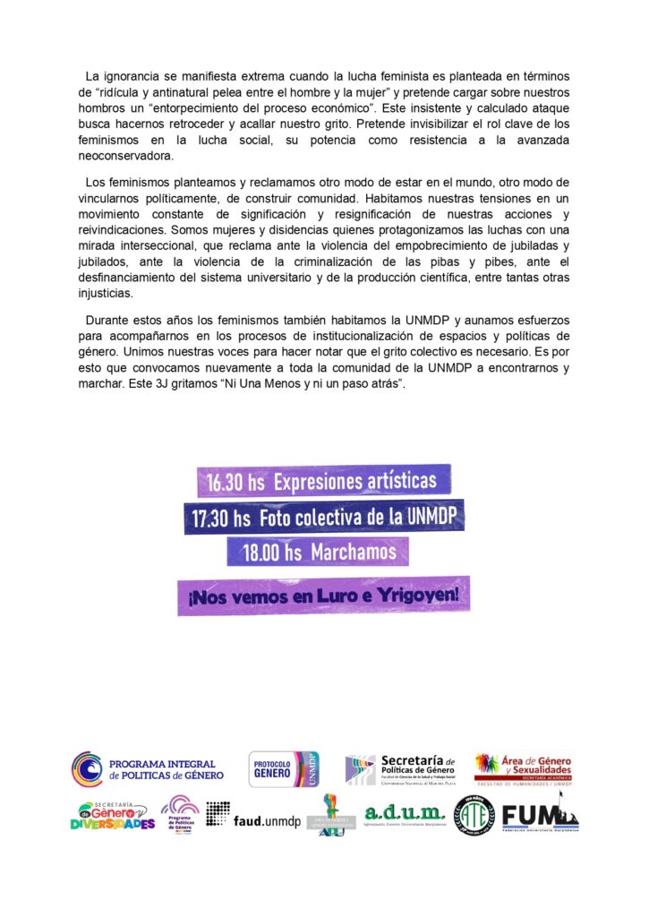 Adjuntamos el pronunciamiento compartido de los espacios de género de la UNMDP.
